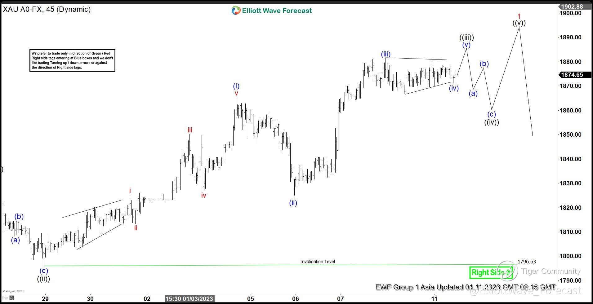 The metal extends higher again in wave (iii) towards 1881.59, and wave (iv) ended at 1871.10. Final leg wave (v) is in progress to end wave ((iii)). Afterwards, Gold should pullback in wave ((iv)) to correct cycle from 12.28.2022 low before it resumes higher again in wave ((v)) of 1. Afterwards, it should end cycle from 11.23.2022 low and the metal should pullback to correct that cycle before the rally resumes again. Near term, as far as pivot at 1796.6 low stays intact, expect pullback to find support in 3, 7, or 11 swing for further upside.