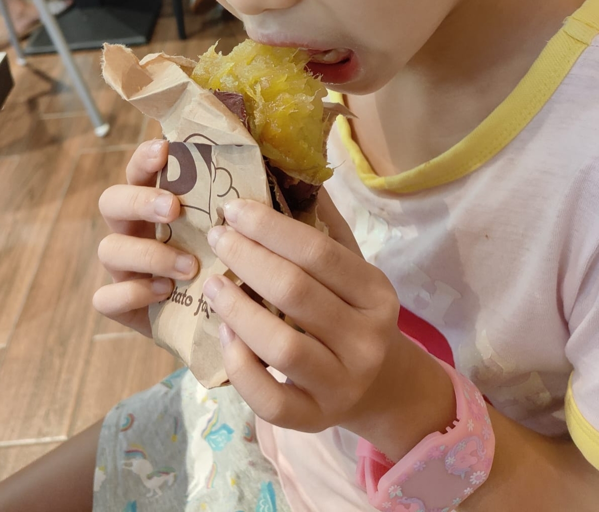 Looking at the glass shelves hungrily, we went in to choose our meals. I've never seen my little one eat so fast and had to remind her to chew carefully. Then after the meal was done, I went to buy some of the warm sweet potatoes. Even though she had eaten quite a bit of the bento set, I guess what they say is true, that there is always room for dessert.
