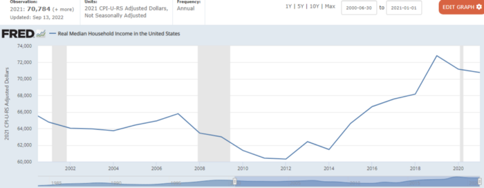 Median Household Income (CPI Adjusted) from 2000–2021 — St. Louis Fred, public domain.