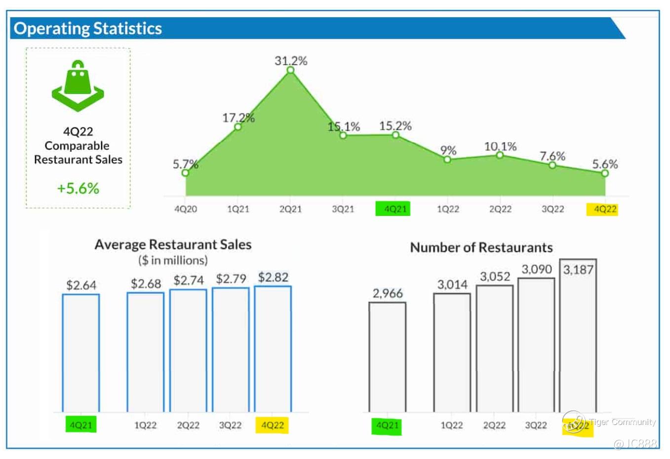 • For starters, it managed to grow its number of restaurants Statesside from 2,966 (Q4 2021) to 3,187 (Q4 2022); thats a whooping 215 restaurants; given the persistent high labour crunch and costs
