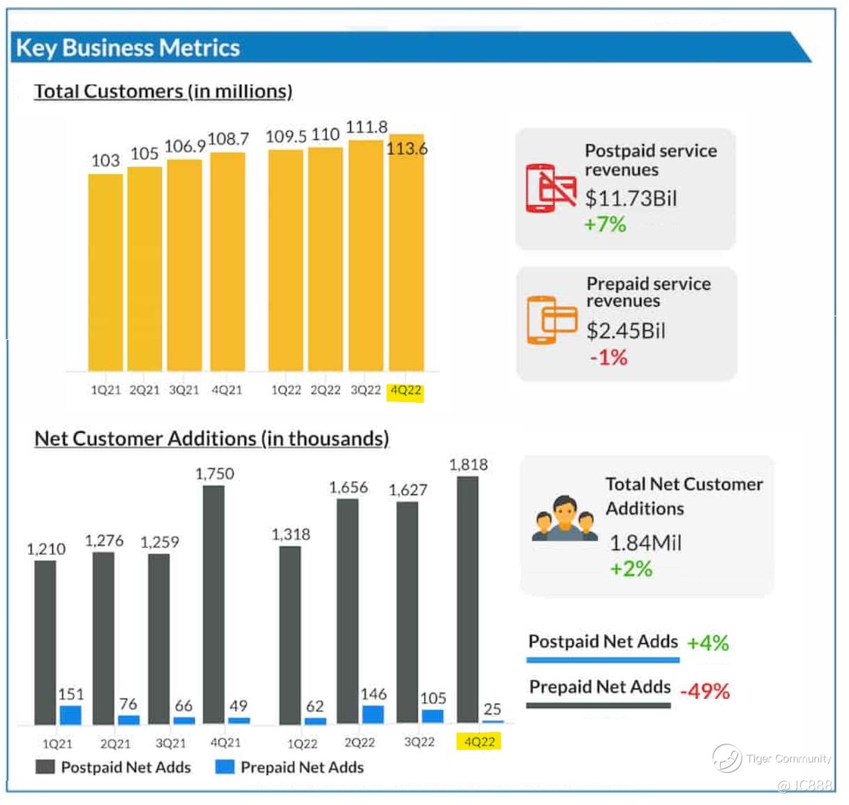 - In Q4 2022, T-Mobile was able to grow its customer base to 113.6 Million customer vs 108 Million (Q4 2021); thats a +5.19% gain