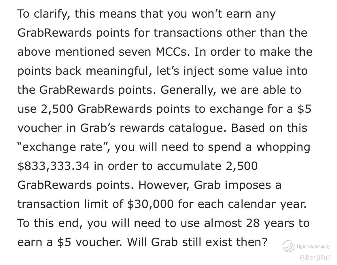 Aside, on the scene of Grab Pay, it's card appears to be nuked. Cash back has plummeted to a mere 0.3% and on top of it, to get 2,500 points for $5, you need to spend $833k. With a transaction limit of $30k per year, it will take 28 years!