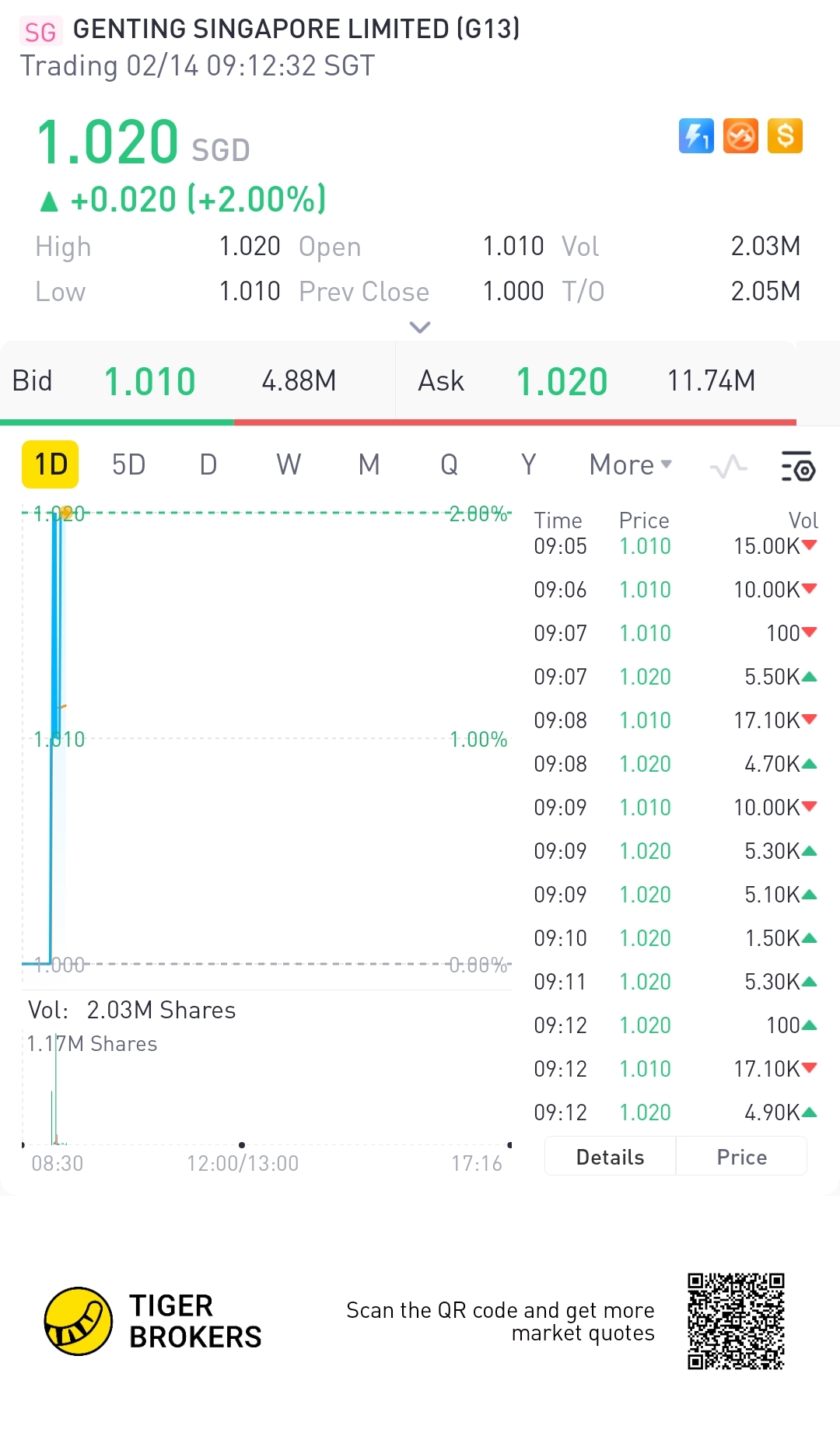$GENTING SINGAPORE LIMITED(G13.SI)$ slowly up
