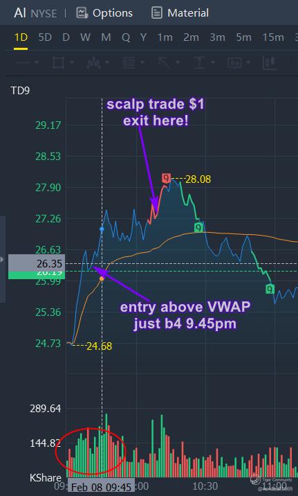 After experiencing the volatility of C3.ai (AI) on 07 Feb 23, i decide this shall be a scalp trade, so profit target set at $1, I decided to enter just before 09.45hrs (around $26.35 after watching how BUY volume have build up from 09.30hrs, and I set my exit price at around $27.40ish.