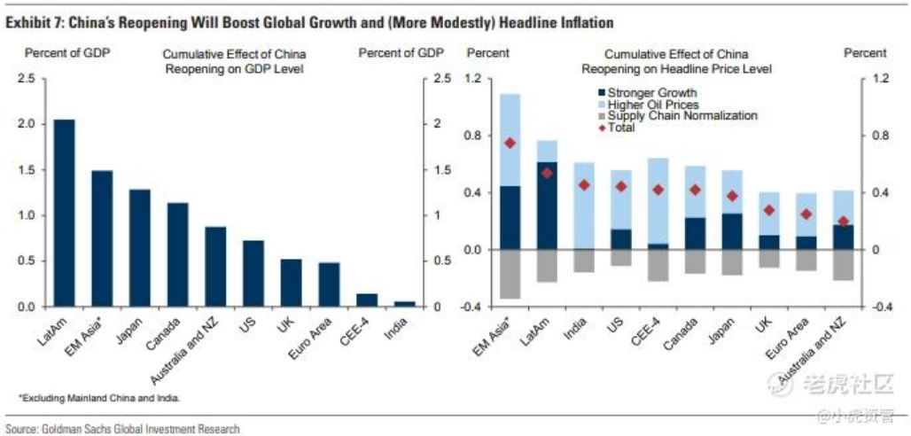 At the same time, Goldman Sachs believes that its latest business activity index shows that China's economic recovery has begun to accelerate, the market's expectation for China's economic growth will continue to improve. In addition to China, raw material exporters and countries that Chinese tourists like to visit will benefit. The normalization of global supply chains, along with stronger growth and higher oil prices, will influence global inflation figures.