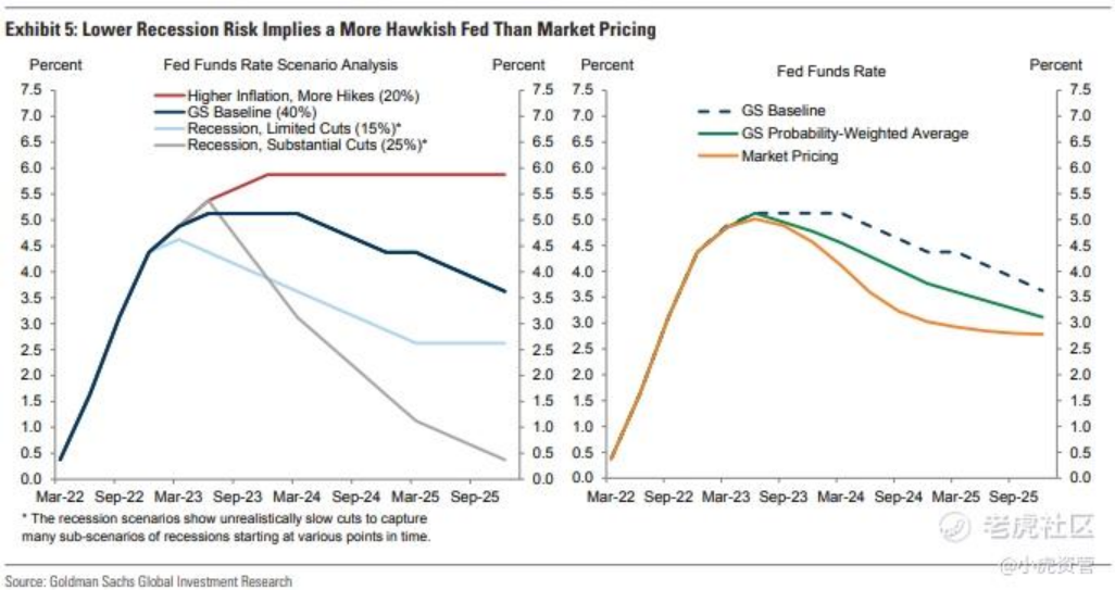 Goldman Sachs' Jan Hatzius team believes that Powell's insistence that the Fed's mission to control inflation is not over, while also believing that a "soft landing" is possible. So Goldman Sachs is pricing the benchmark rate higher than the market.