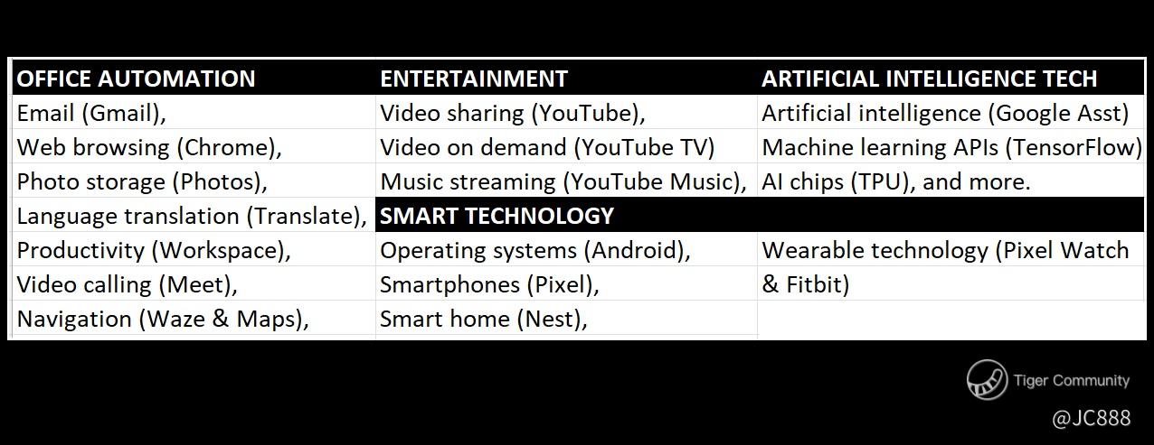 - In addition to its products-rich offerings (see below table); Alphabet is branching into non-IT specialities eg. (1) Quantum computing (Sycamore), (2) Self-driving cars (Waymo, formerly Google Self-Driving Car Project), (3) Smart cities (Sidewalk Labs), & (4) Transformer models (Google Brain)