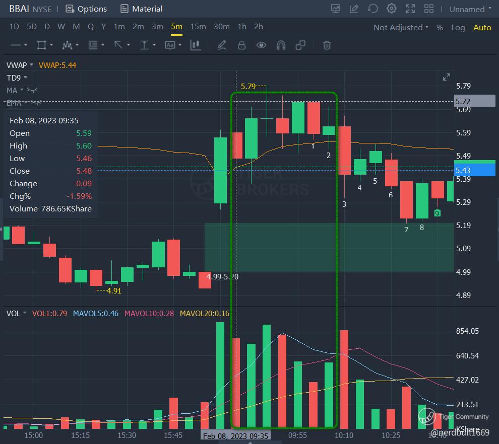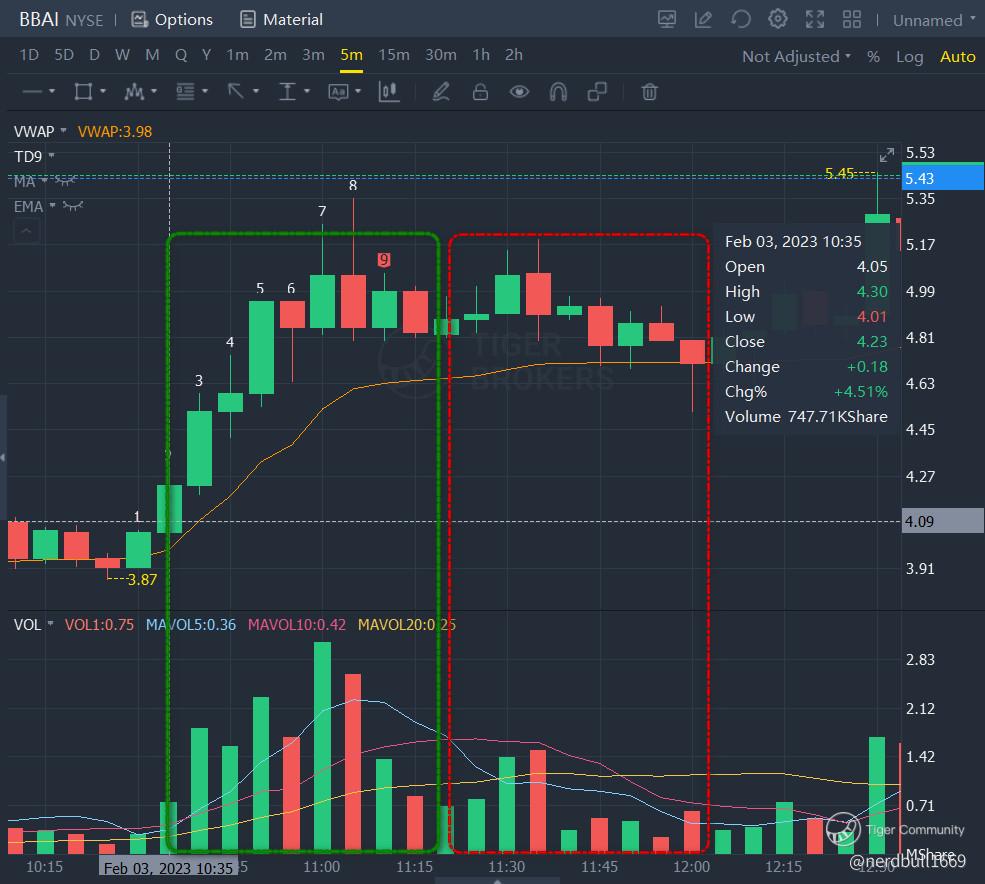 As we know BBAI close at +44.17% for 03 Feb trading session, I have used 5 mins chart to try to explain.