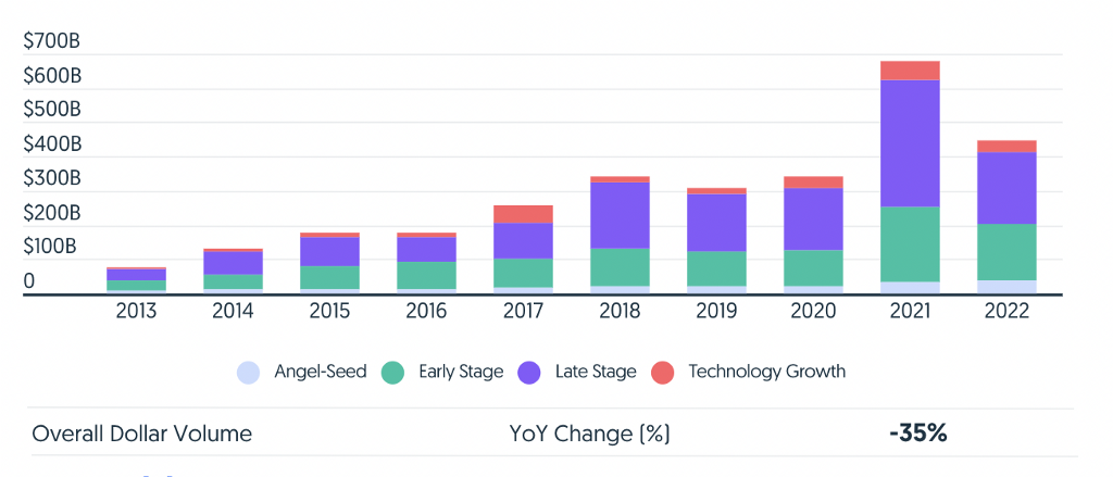 The chart of the Global Venture Dollar Volume from 2013 to 2022 shows that funding slide in 2022 sets the stage for another tough year.