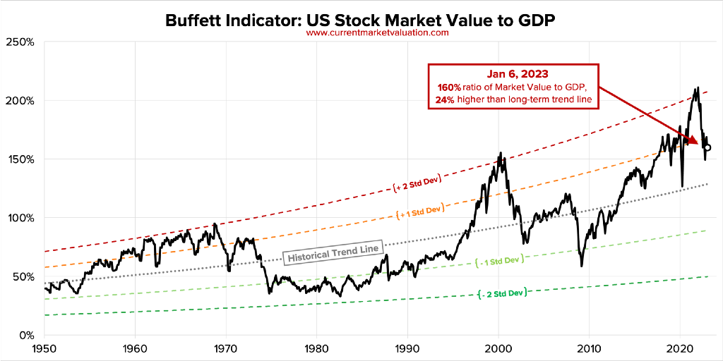 Another popular indicator is the popular Buffett Indicator. It measures the value of U.S. stocks in relation to the economy. In 2022, it came back from its stretched levels but is still about 1 Standard Deviation above its historical average.