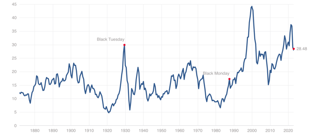 By many measures, global valuations are still above their long-term trends. For example, Shiller’s PE Ratio is at 28, way above the average range of 15–20.