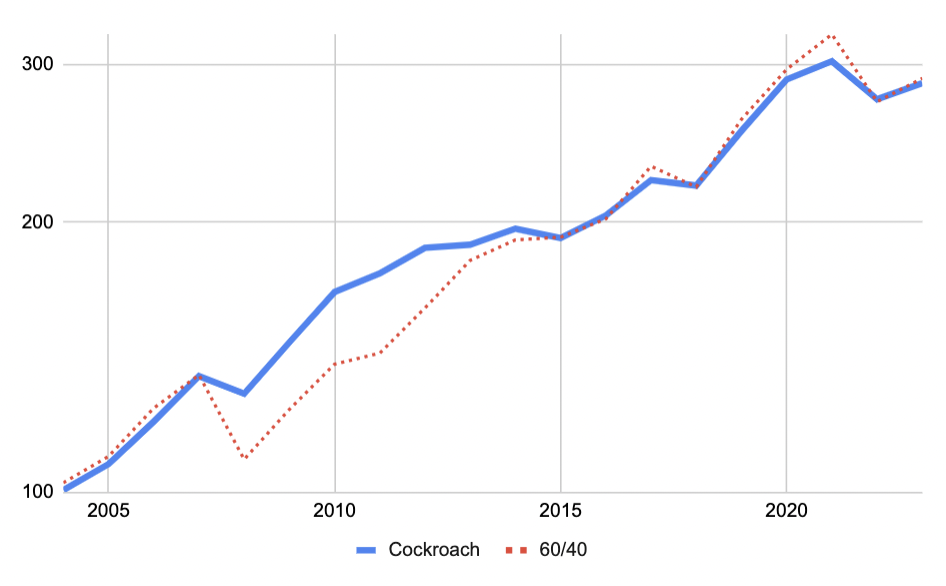 The Cockroach Portfolio is the simplest, most inexpensive, and lowest effort way to diversify a portfolio. The Cockroach Portfolio holds 25% stocks, 25% bonds, 25% cash, and 25% Gold. In 2022, it only lost -9%, while a 60/40 stocks/bonds portfolio was down -16%. It achieved this relative outperformance with a max. drawdown of only -16% (vs. -35% 60/40). This is a great example of how to profit effortlessly from the benefits of very basic diversification. The chart below shows the long-term performance of the Cockroach Portfolio vs. a Global 60/40.
