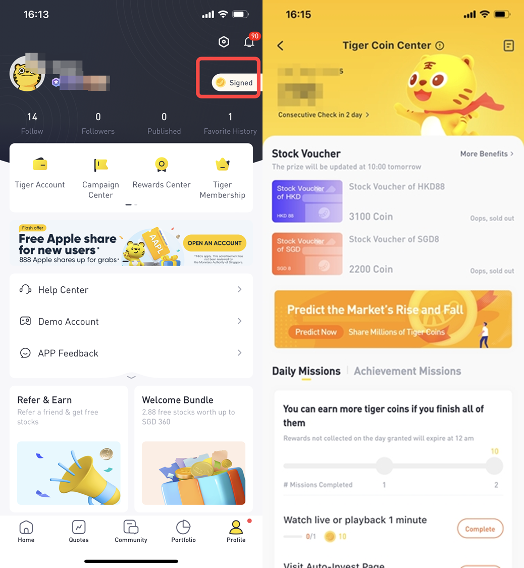 Feeling a little short on Tiger Coins? Fret not! Simply participate in Tiger community activities and complete Tiger Coin Center missions to win more Tiger Coins. Besides just Tiger merchandise, the Tiger Coins you earn can also be exchanged for stock vouchers, commission-free trades, virtual profile frames, and much more!