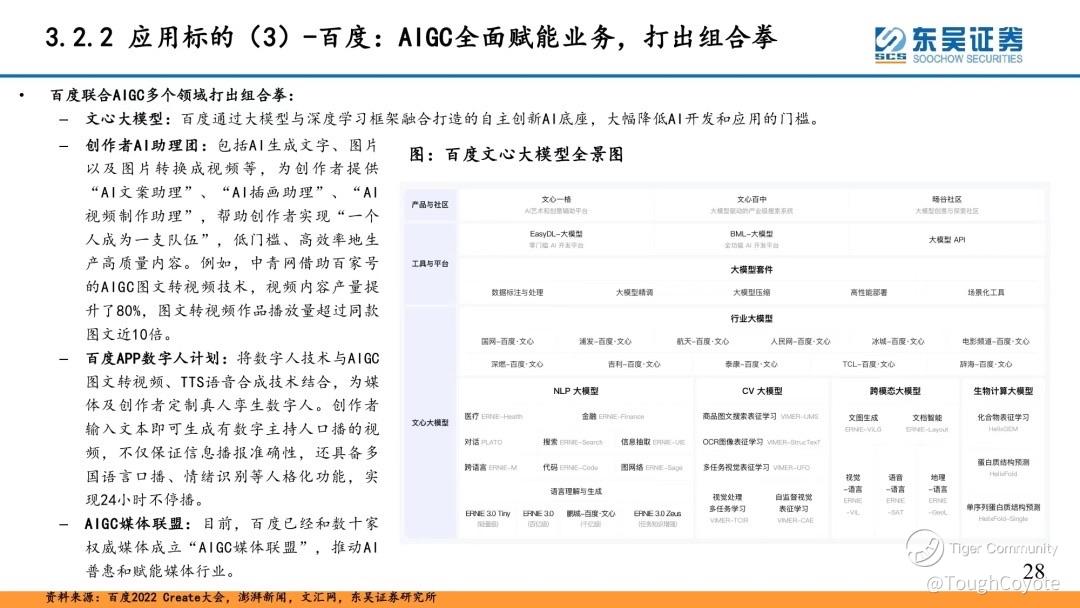 Regarding the application scenarios of AIGC, Baidu has also done a lot, as shown in the figure below, which is sorted out for Soochow Securities:
