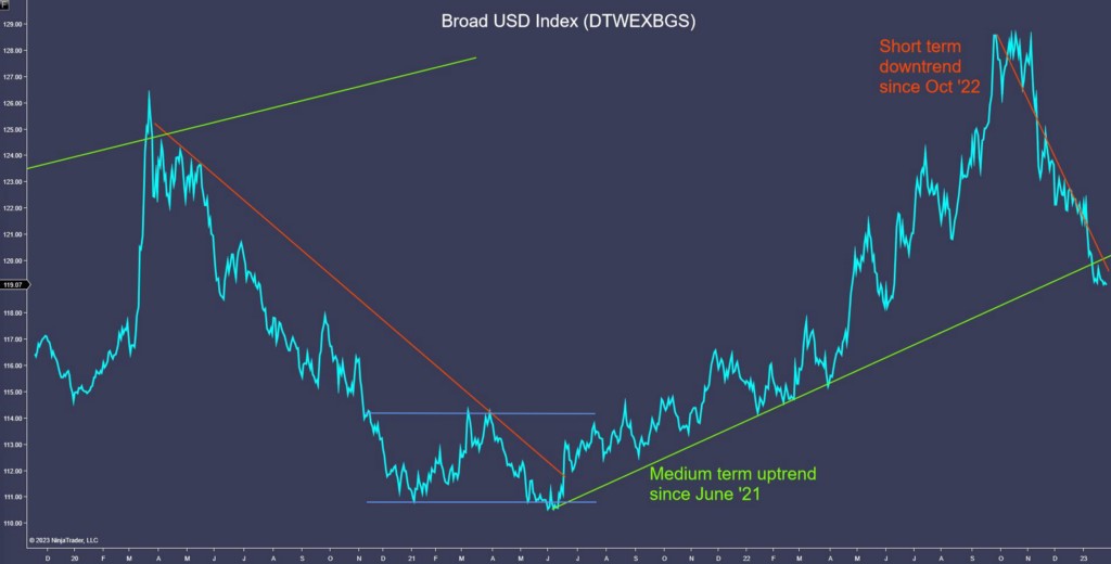 • Commodities also aren’t aligned. Oil and Aluminum remain range bound, while Copper and Iron Ore have rallied strongly since Oct ‘22