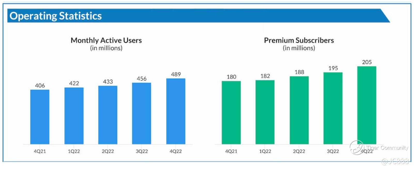 - For starters, (1) its revenue beat forecast & Q4 2021 results, (2) its MAU is uppped +20% and (3) its paid subscribers of 205 Million is upped +14% from a year ago.