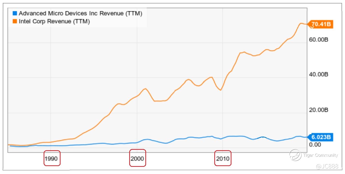- Its initial collaboration and subsequent rivalry with $Intel(INTC)$ could be traced to the fact that both founders were ex-colleagues at Fairchild Semiconductor.