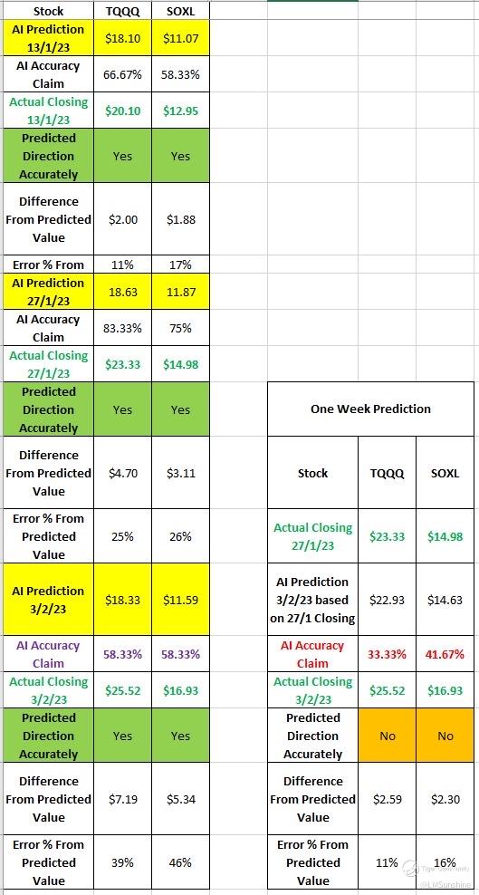 ⭐️🏆⭐️ The 🔮AI was Not Accurate In Predicting the 🐂-ish Move for both TQQQ & SOXL for 3/2, BUT the deviations from the actual value were significantly reduced from 39% (based on prediction from 3 weeks earlier) to 11% (based on prediction from 1 week earlier) for TQQQ & from 46% to 16% for SOXL🤩😍