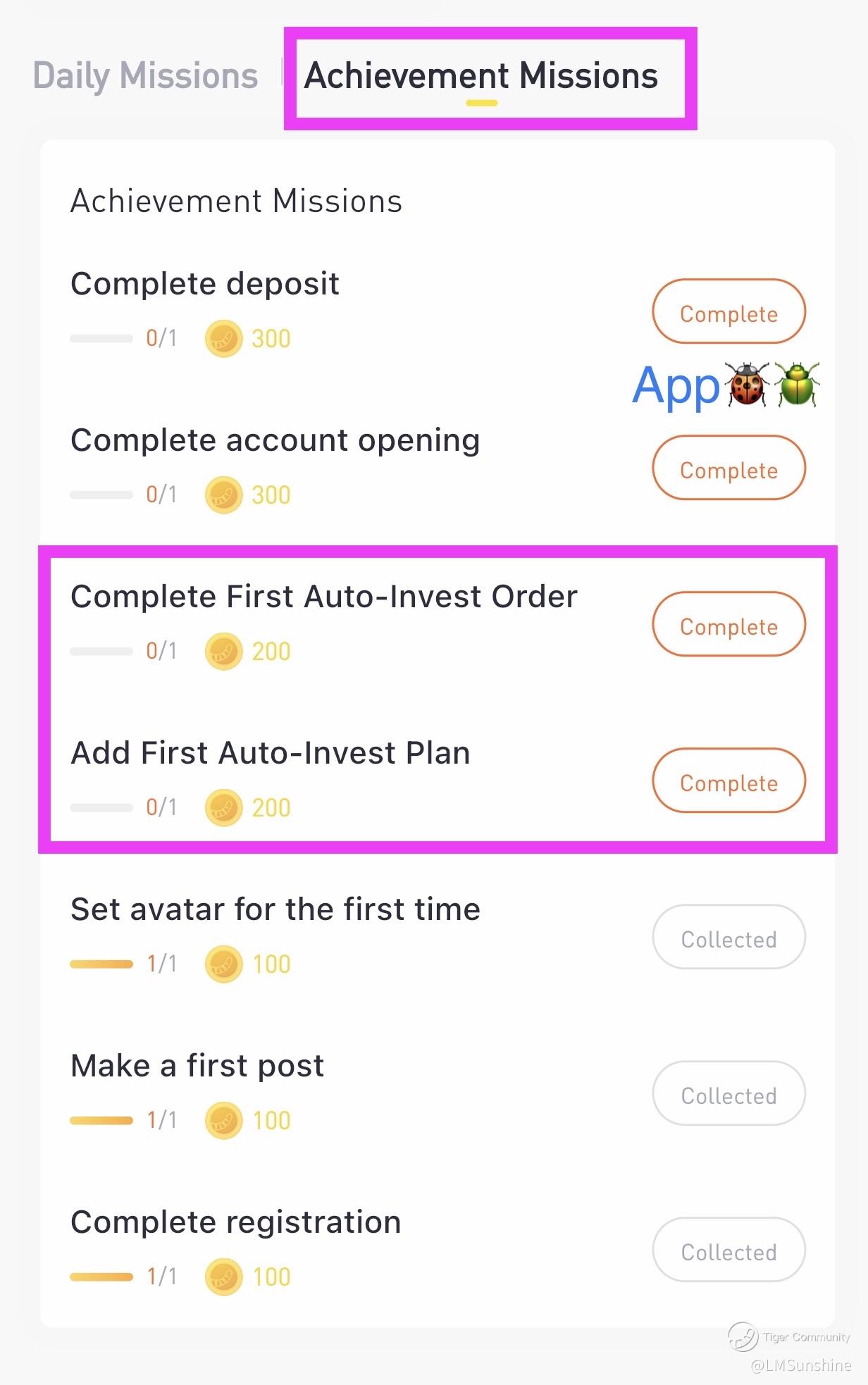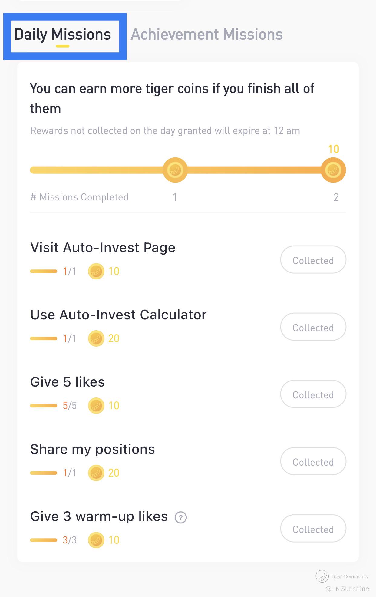 🚨 There’s 2 new missions for Auto-Invest😉❗️Check that you’ve been awarded the coins for the Achievement Missions. Mine had an app🐞🪲 & it didn’t recognise me completing the tasks but helpful customer service officers helped to upload the 🐯🪙 into my account😉 To check on your 🐯🪙 history, see photos: