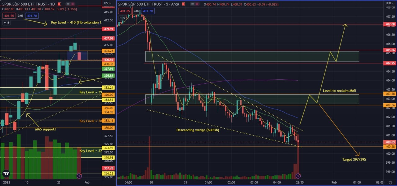 - Look for final gap fill between 402 and 403 which is also for the price action to reclaim MA5