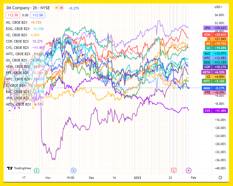 The 15 stocks are $Meta Platforms, Inc.(META)$ , $JPMorgan Chase(JPM)$ , $Bank of America(BAC)$ , $Citigroup(C)$, $Wells Fargo(WFC)$ , $Pfizer(PFE)$ , $Exxon Mobil(XOM)$ , $Goldman Sachs(GS)$ , $Intel(INTC)$ , $CVS Health(CVS)$ , $ConocoPhillips(COP)$ , $Verizon(VZ)$ , $EOG Resources(EOG)$ , $Morgan Stanley(MS)$ , $3M(MMM)$ .