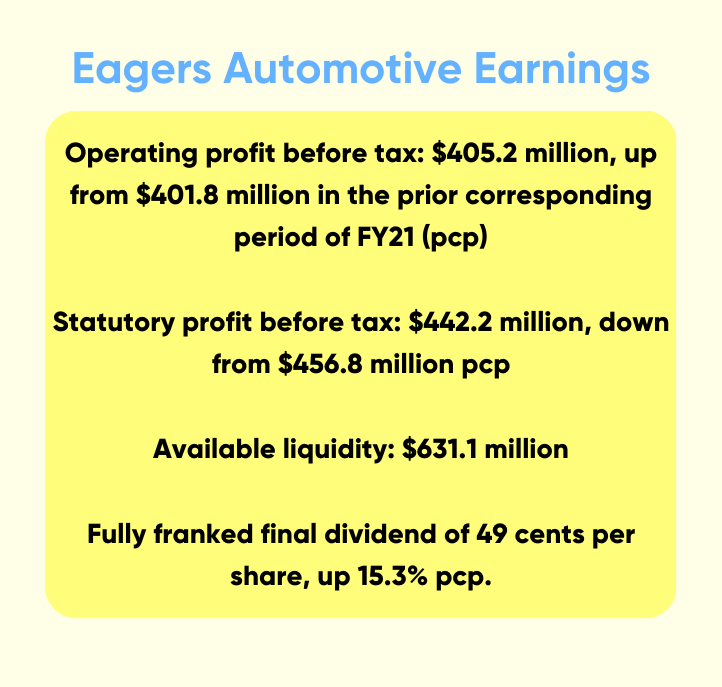 The Eagers Automotive, Australia's biggest car sales group, announced a final dividend of 49 cents per share for FY22, creating a record total full-year dividend of 71 cents per share for investors.
