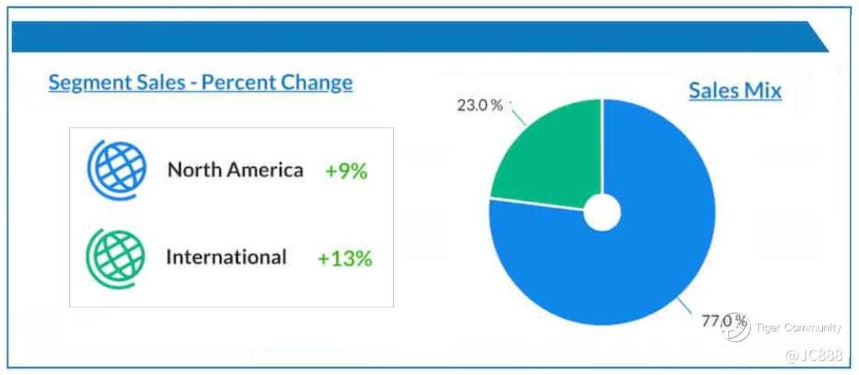 Bulk of revenue comes from North America (77%) and balance (23%) from International market segment