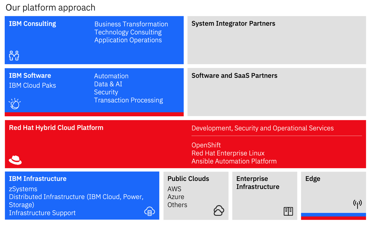 But instead of competing with them, IBM chose to partner with these large cloud companies.Arvind, the new CEO of IBM, said last year,IBM's business with Microsoft is worth more than $1 billion, and its business with Amazon is even larger.In 2019, IBM acquired Red Hat for $34 billion$Red Hat(RHT)$. This acquisition gives IBM access to the large open source software community.