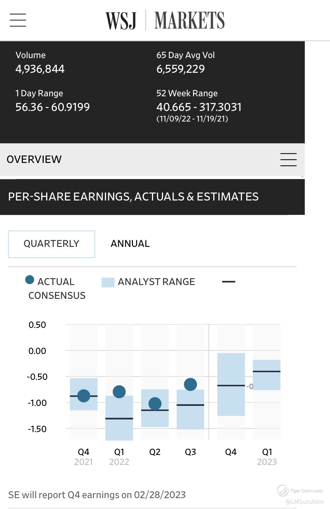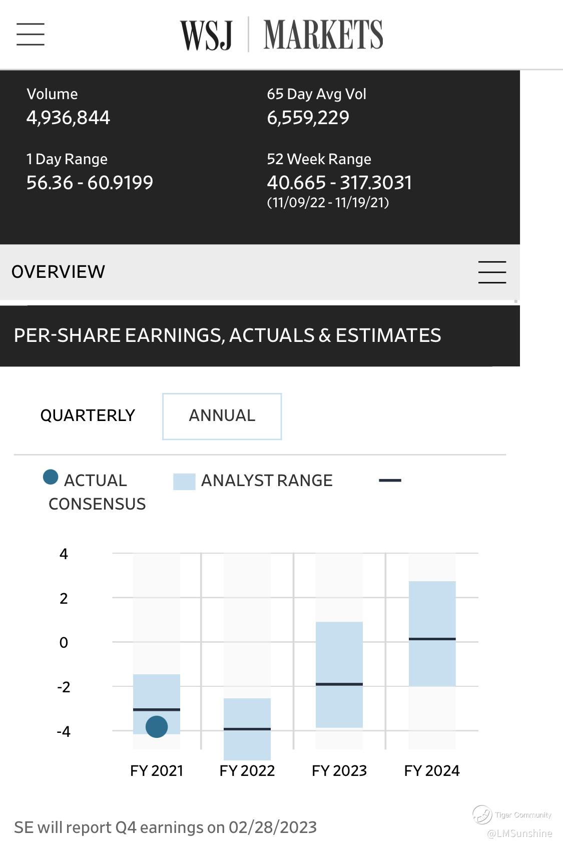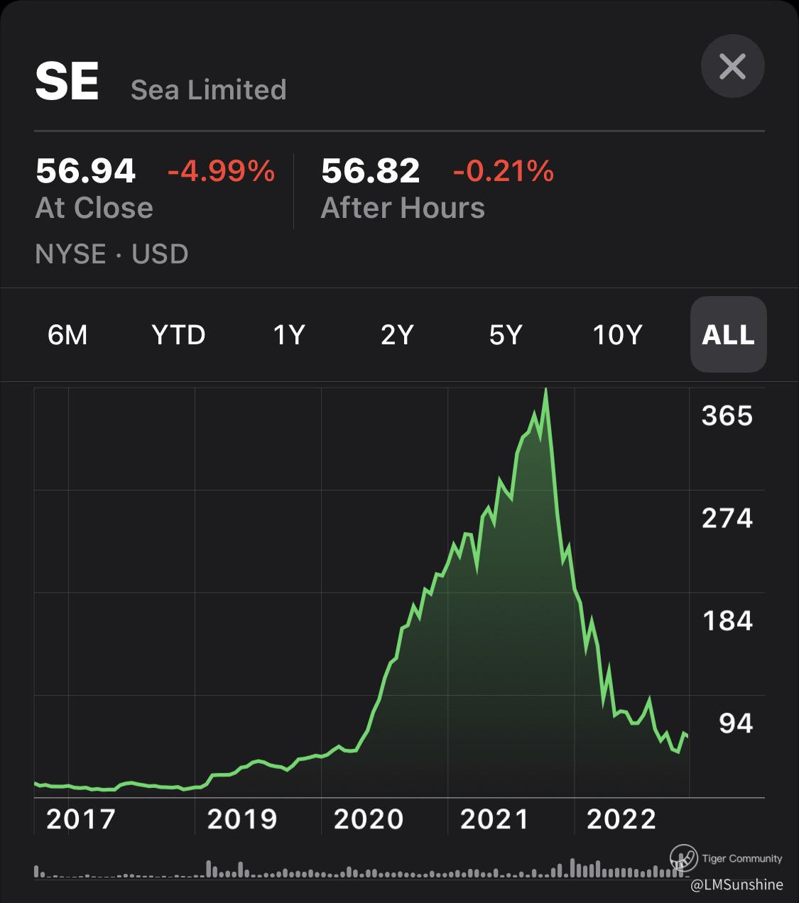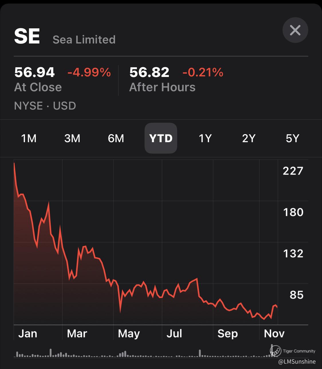 (3) 🌊SE stock history: It exploded in 2020 and reached a high of 372.70 in 2021💥🐂💥🐂 Ever since then, it has been on a downward trend all the way reaching a 52-Week low of 40.66🪨🪨🪨and closing at 56.94 on 18/11.