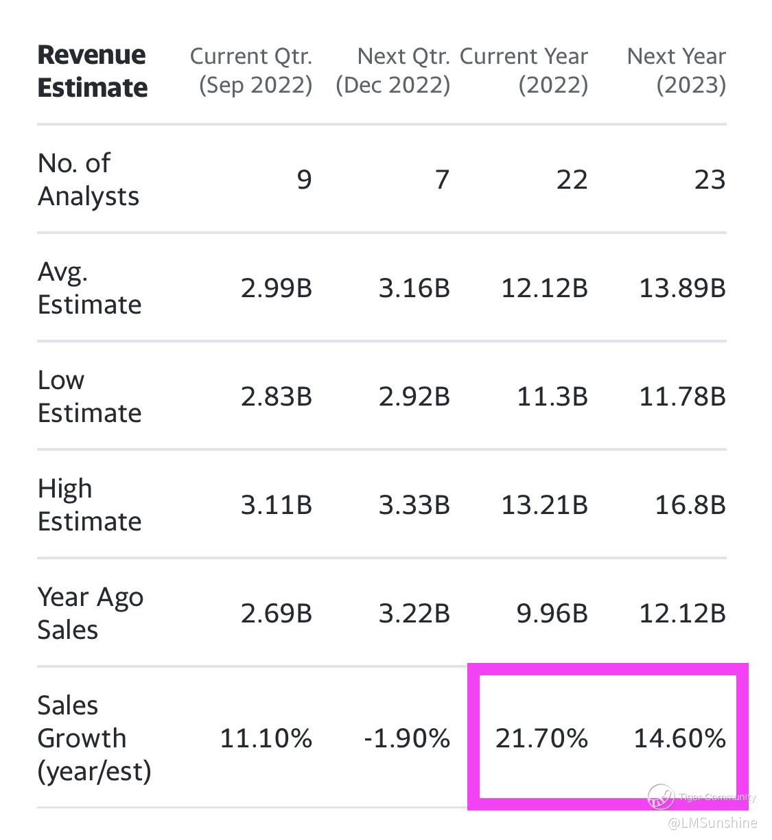 (2) YF EPS in FY2023 are expected to be higher than FY2022. Revenue for FY2023 are also expected to be higher than FY2022 but year-on-year sales growth is expected to decline from 21.7% to 14.6%. Growth estimates for Q3 was -31.0% and projection for Q4 is 18.8% BUT no industry/sector/S&P500 comparisons were provided.