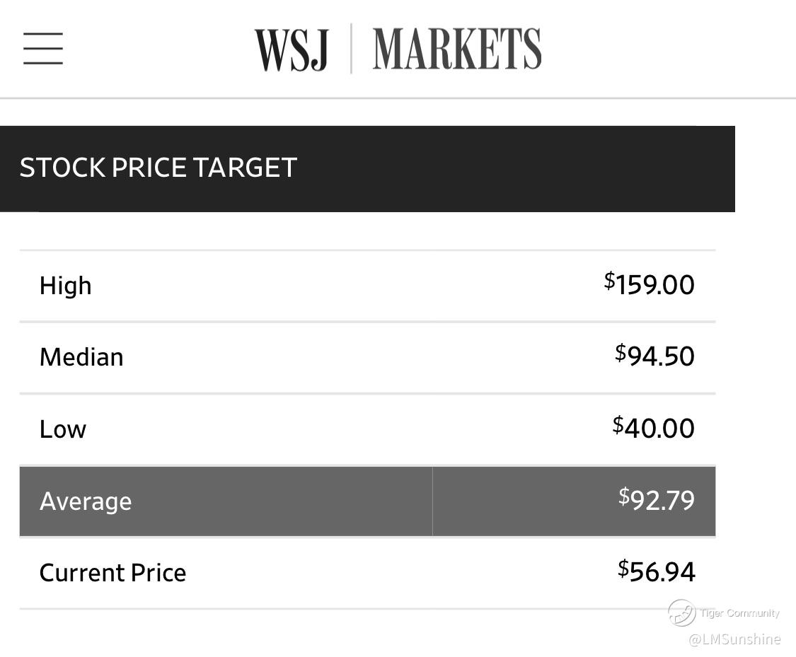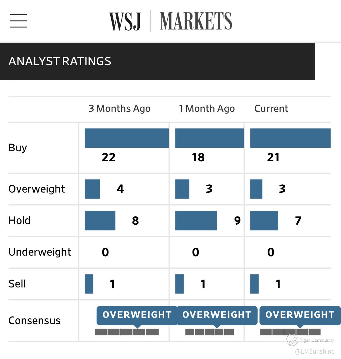 (5) WSJ analysts have a current consensus rating of overweight with 21 buy, 7 hold, and 1 sell. The average target price is $92.79 with a range of $40 to $159.