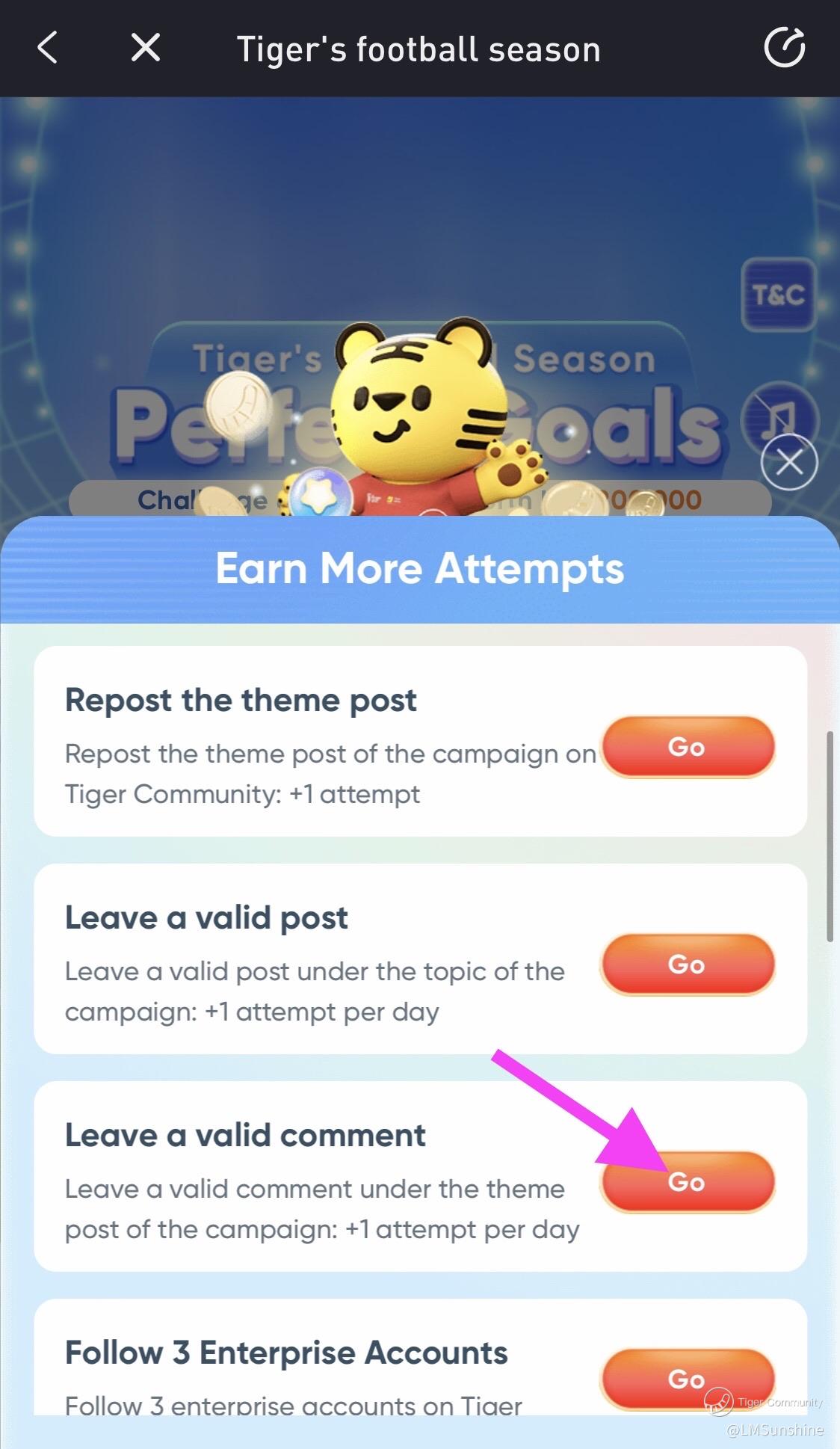 ⭐️ For example (Leave a valid comment in the campaign page): Click on “Go” & it’ll lead you to the task ➡️ Once done, go back to the Game Page to CLAIM your extra attempts.