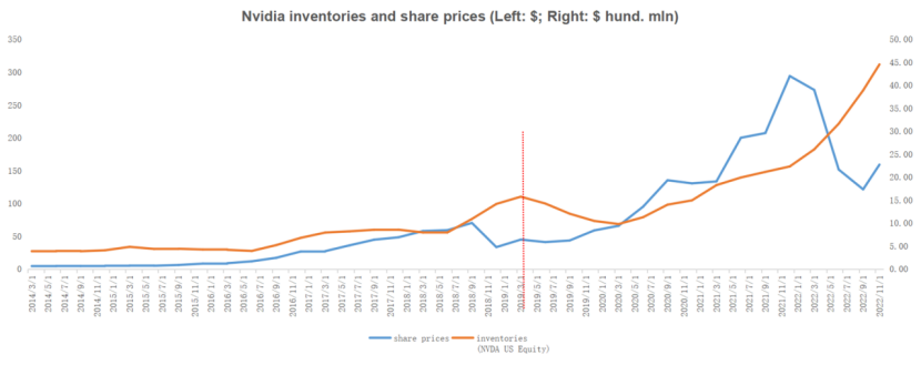 In light of Nvidia's performance in the semiconductor down cycle in 2018, the stock price will bottom out when the inventory started to decline: