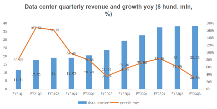 1) Data center revenue was USD 3.83 billion, up 30.6% year-on-year, slightly exceeding the market expectation of USD 3.79 billion: