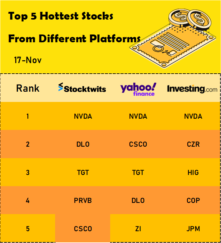 The Top5 trending tickers on Yahoo Finance: $NVIDIA Corp(NVDA)$ $Cisco(CSCO)$ $Target(TGT)$ $DLocal Limited(DLO)$ $ZoomInfo Technologies Inc.(ZI)$