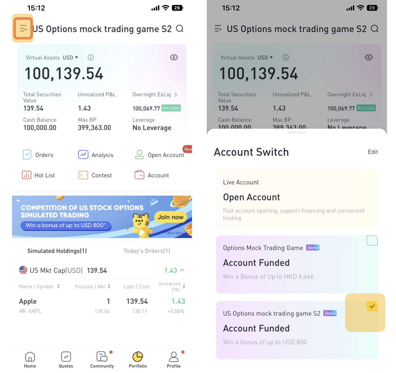 Step 2: Switch to the competition account: Log in to Tiger app > 【Trade】 > Click on the three horizontal lines in the upper left corner to open【US Options mock trading game S2】