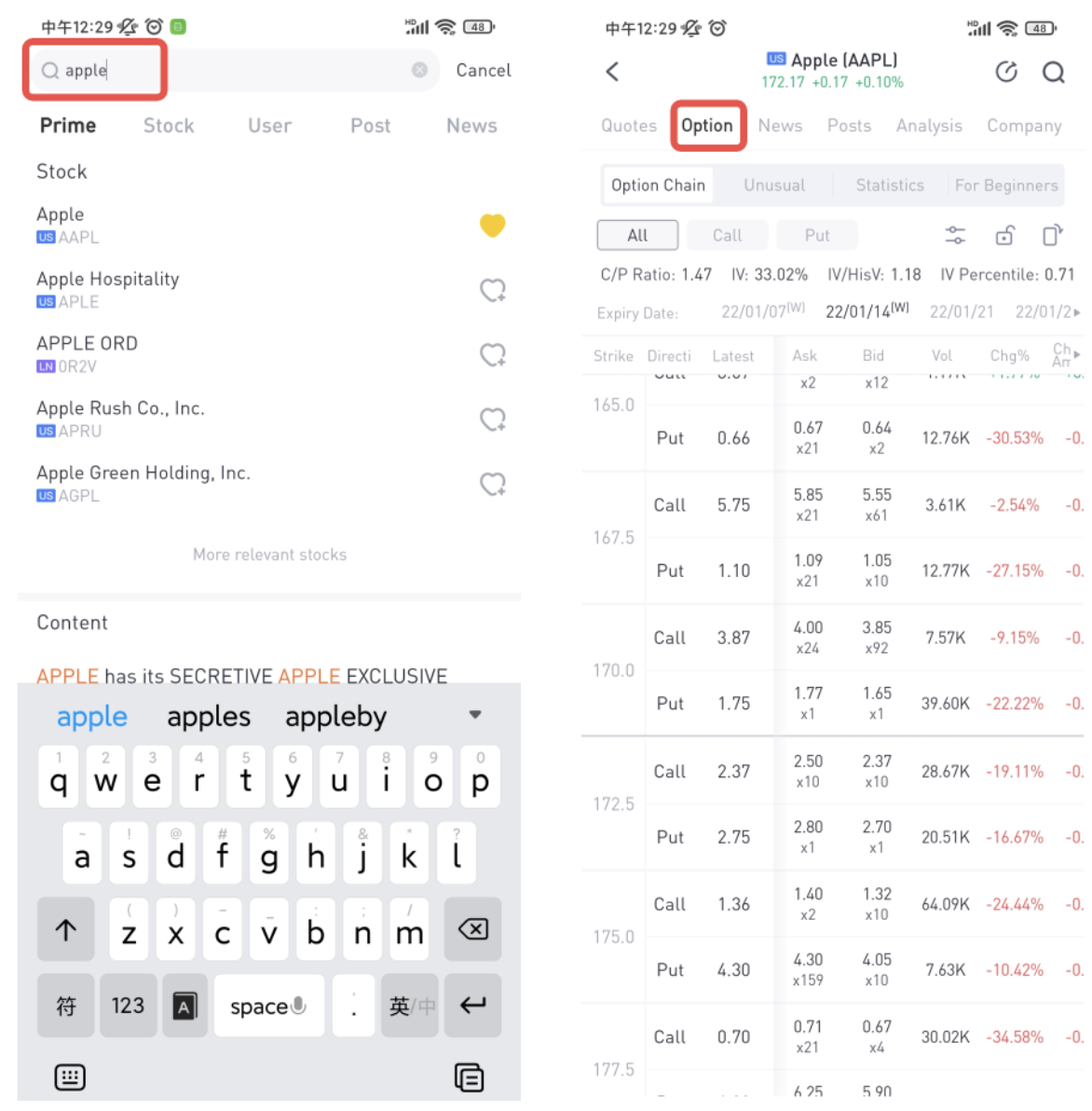 Step 3: Conduct a simulated transaction of US stock options using the account, taking Apple options as an example: search for 【apple】 > enter the Apple stock details page > click on the Options tab at the top of the page > select any option contract to trade