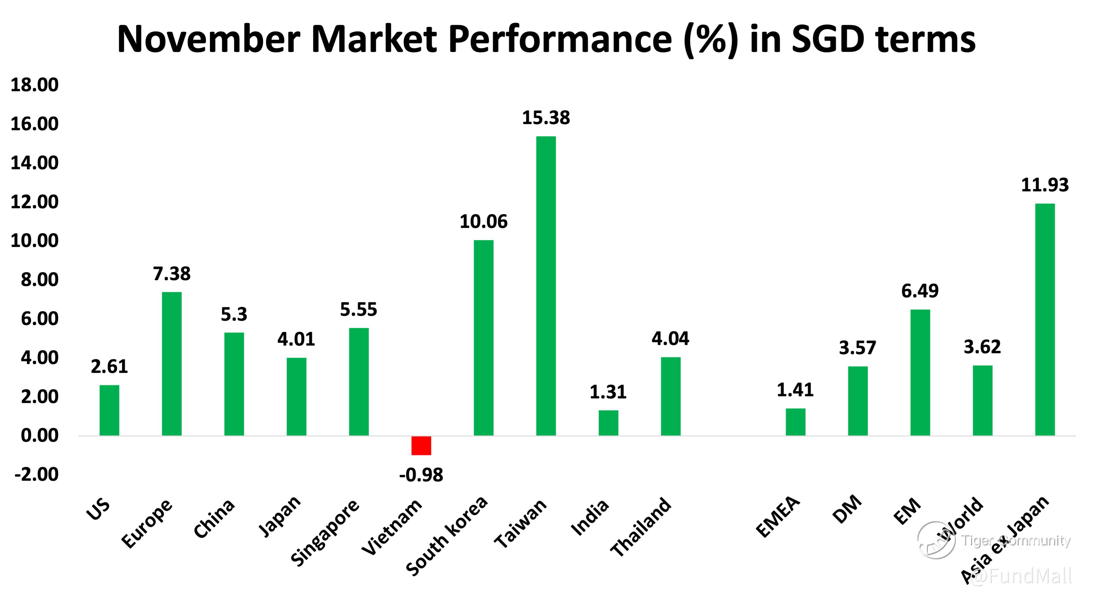 Market participants have been hoping for a global market recovery in 2H22 but have since been disappointed. Equities and fixed income globally have sold off hard thanks to i) Central Banks’ firing aggressive rate hikes in their quest to quell inflationary pressures, ii) recessionary fears and iii) China’s zero covid policy weighing down on sentiments in Asia. That being said, we are finally seeing some positives amidst a challenging macro environment. Markets as a whole were able to build on the momentum in October, delivering investors some good returns in November.