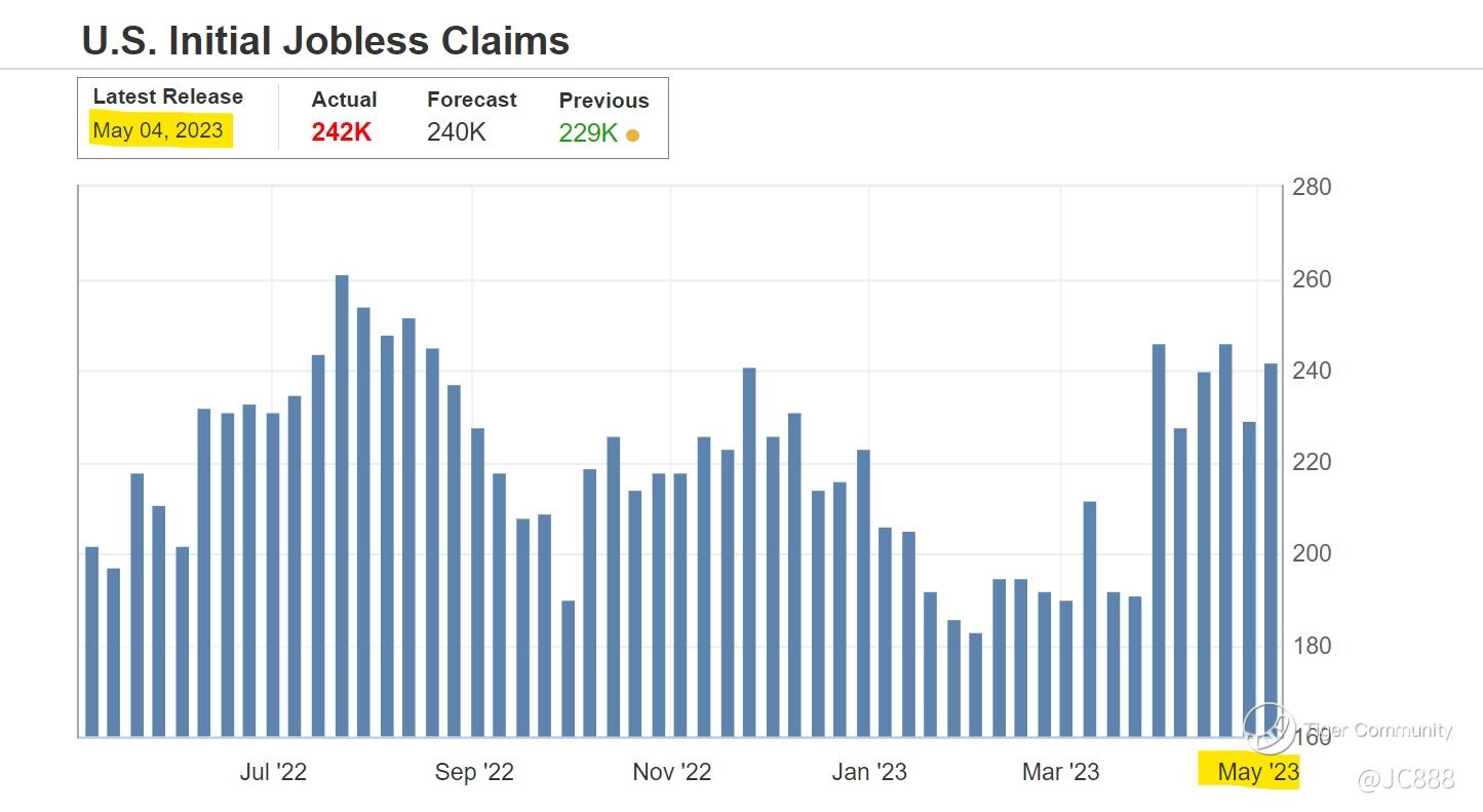 Jobless claims for week ending 04 May 2023 came in at 242,000 claims, higher than the forecast of 240,000 and an increased of +13,000 claims (+5.68%) from previous week’s 229,000 claims.