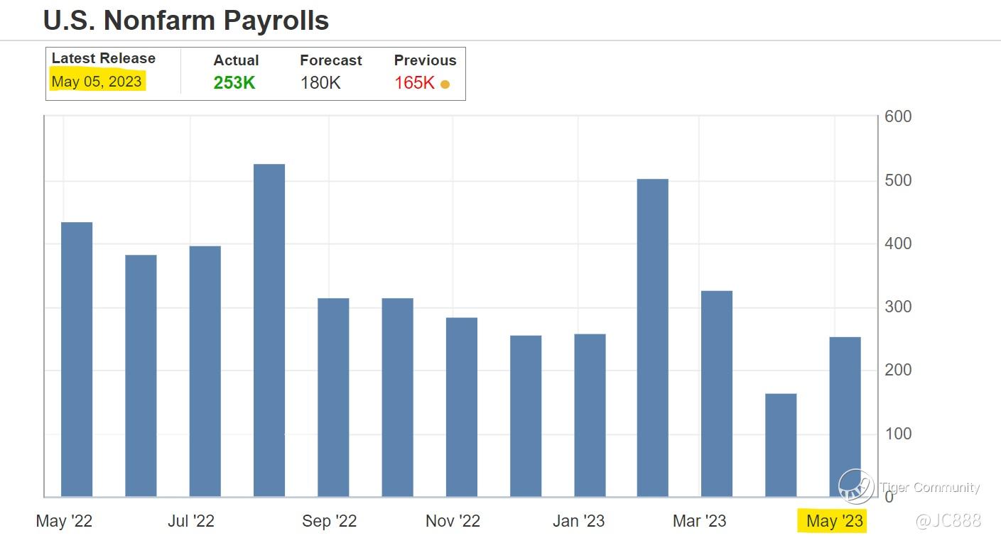 US latest non-farm payroll dated 05 May 2023 came in at 253,000 jobs. This is an increase of +88,000 job (+53.33%) from previous month of 165,000 jobs.