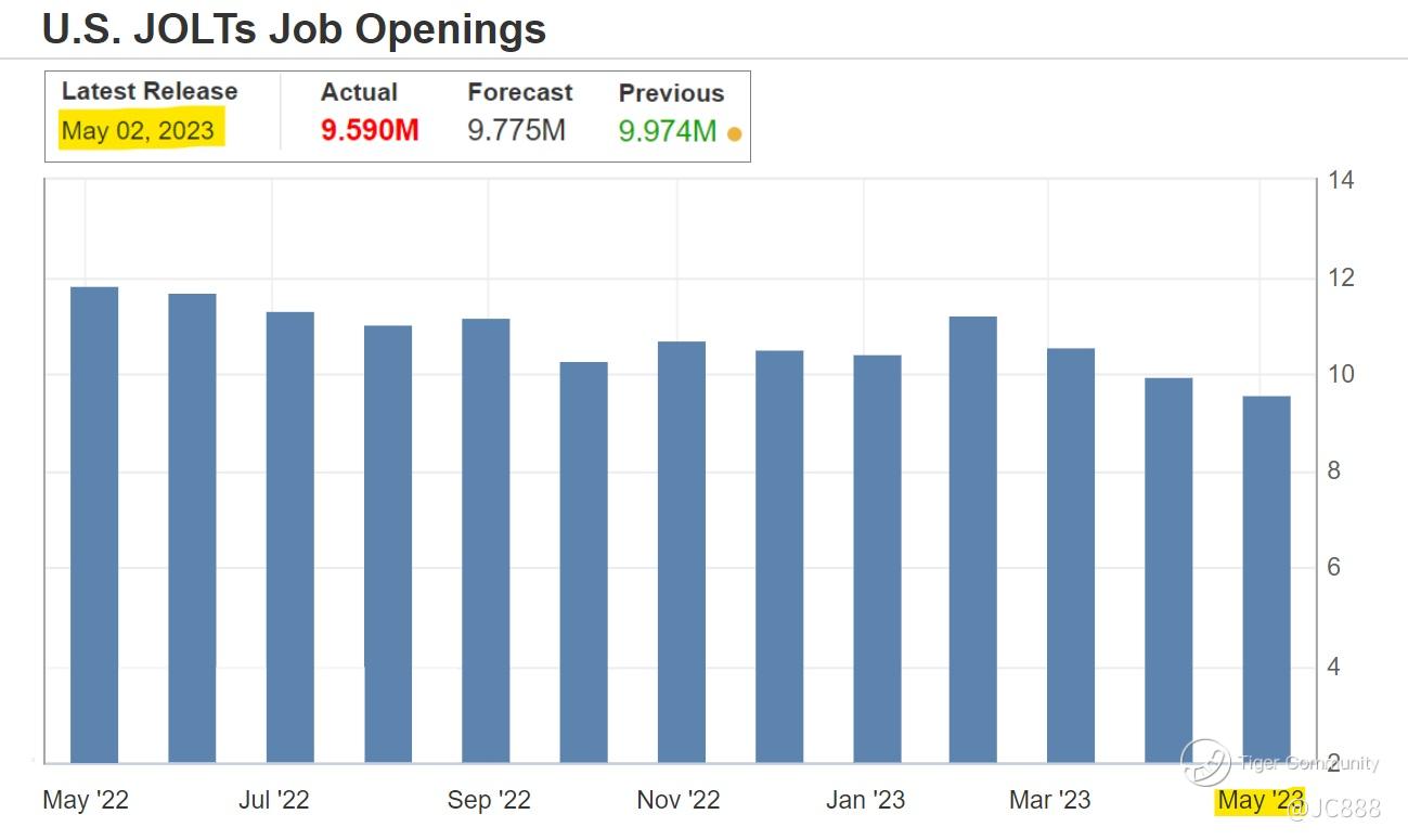 For May 2023, JOLTs came in at 9.59 Millions, that is -384,000 jobs less (-3.85%) compared to previous month of 9.974 Million jobs.