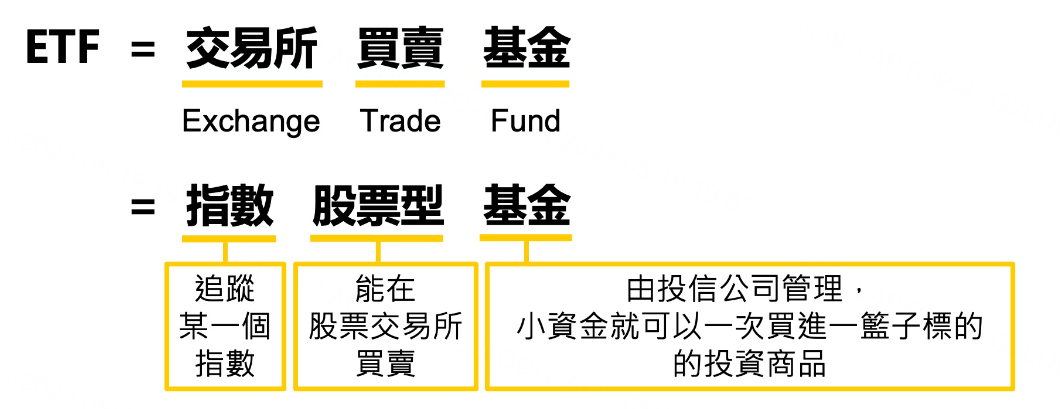 ETF,就是Exchange-Traded Fund的簡稱,即「交易所買賣基金」,顧名思義就是可以在證券交易所進行買賣的基金。