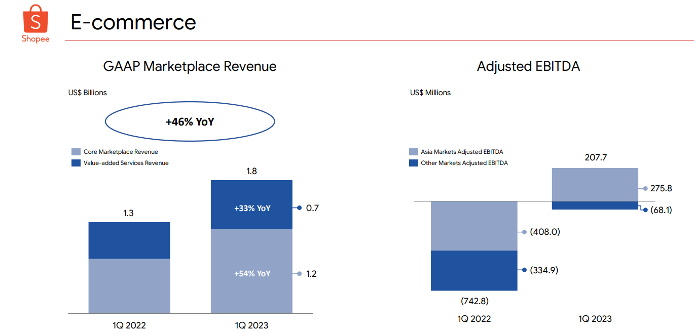 1. The e-commerce business has strengthened its monetization capabilities in a more competitive environment. Since achieving profitability in Q4 2022, the company has been focused on improving profit margins and cost control measures. Shopee currently operates only in Southeast Asia and Brazil, where single order losses have decreased by 77% this quarter. Overall, the e-commerce business achieved an EBITDA of $276 million USD - compared to a loss of $408 million USD during the same period last year - with marketing expenses playing a key role.