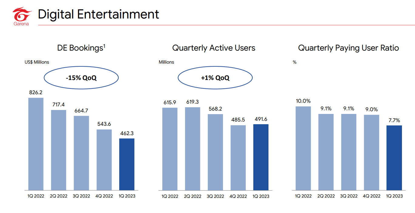 Firstly,the gaming business is not performing and probably won’t perform well. FreeFire's decline phase coupled with new games that failed to reach similar heights means that Sea's active users and revenue from gaming have both declined.Company focus now lies on maintaining game business profit margins instead.
