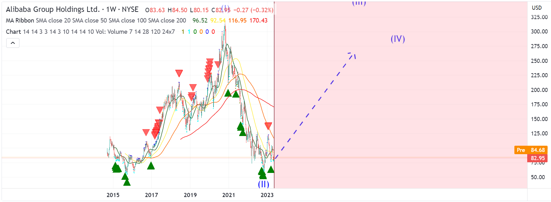 $Alibaba(BABA)$ since BABAs IPO, some may have missed out on the nice upward move. I got in and got out early myself. Now tho putting a long term investment view I see some good entry points based on oscillators and stochastic data from weekly chart data. In combination with simple yearly wave cycles, i see BABA is positioned in an attractive longterm buyers entry point. I've probably seen a completion in correction and entering the next Leap for a 3rd wave. There may some accumulation interest going on, early indication of buyer interest.