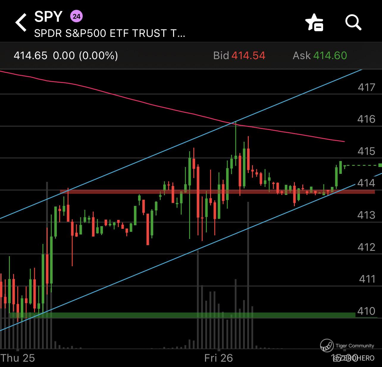 6.5% gain taking puts from the debt crisis and weak banking sector at open. ⚠️ Looking at puts under 412.3 and calls above 415.3 on Friday after the PCE news releases.