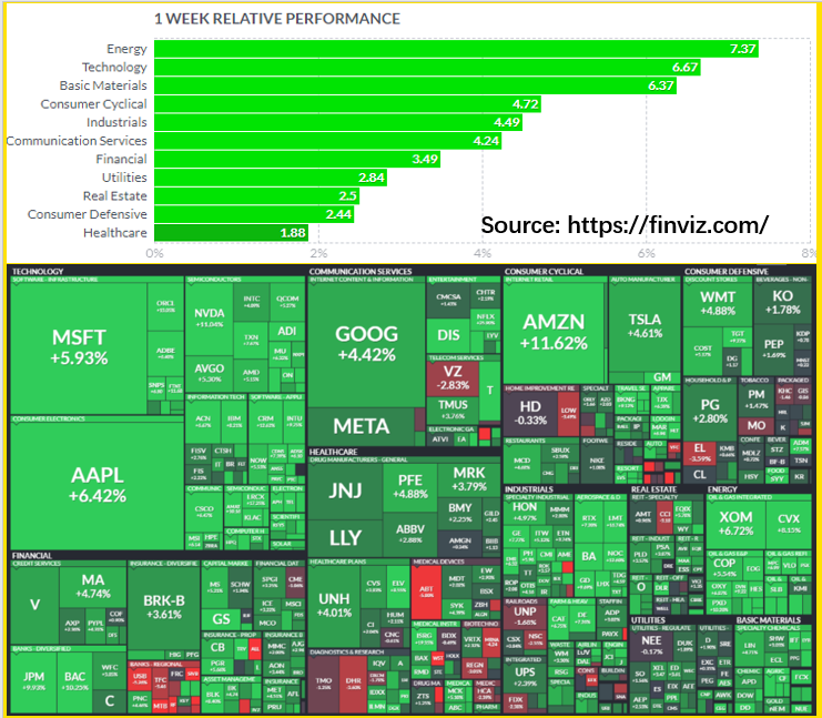 The major U.S. stock indexes started the week and ended it with sizable daily rallies, rebounding from the previous week’s mostly negative results. The $S&P 500(.SPX)$, the $NASDAQ(.IXIC)$, and the $DJIA(DJIA)$ all finished with weekly gains of around 5% as investors focused on quarterly earnings and prospects for further interest-rate increases.