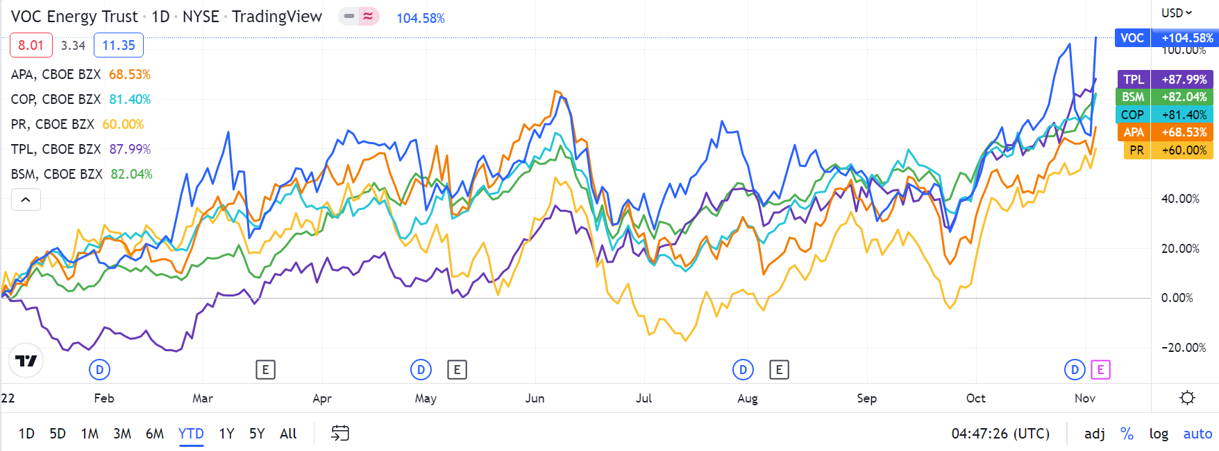 VOC is an energy trust which is almost entirely exposed to crude oil prices, it is a statutory trust formed among VOC Brazos Energy Partners, L.P. (VOC Brazos), a Texas limited partnership, as trustor, The Bank of New York Mellon Trust Company, N.A., as Trustee, and Wilmington Trust Company, as Delaware Trustee .