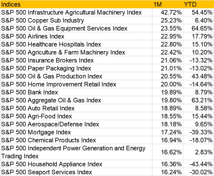 In S&P 500 Index, the best performing industry are infrastructure agricultural, copper mine, oil and gas service, aviation, health hospital, agriculture, insurancpaper, oil and gas exploitation, home decoration, banking and so on. These are also the main industries to be restored at present.