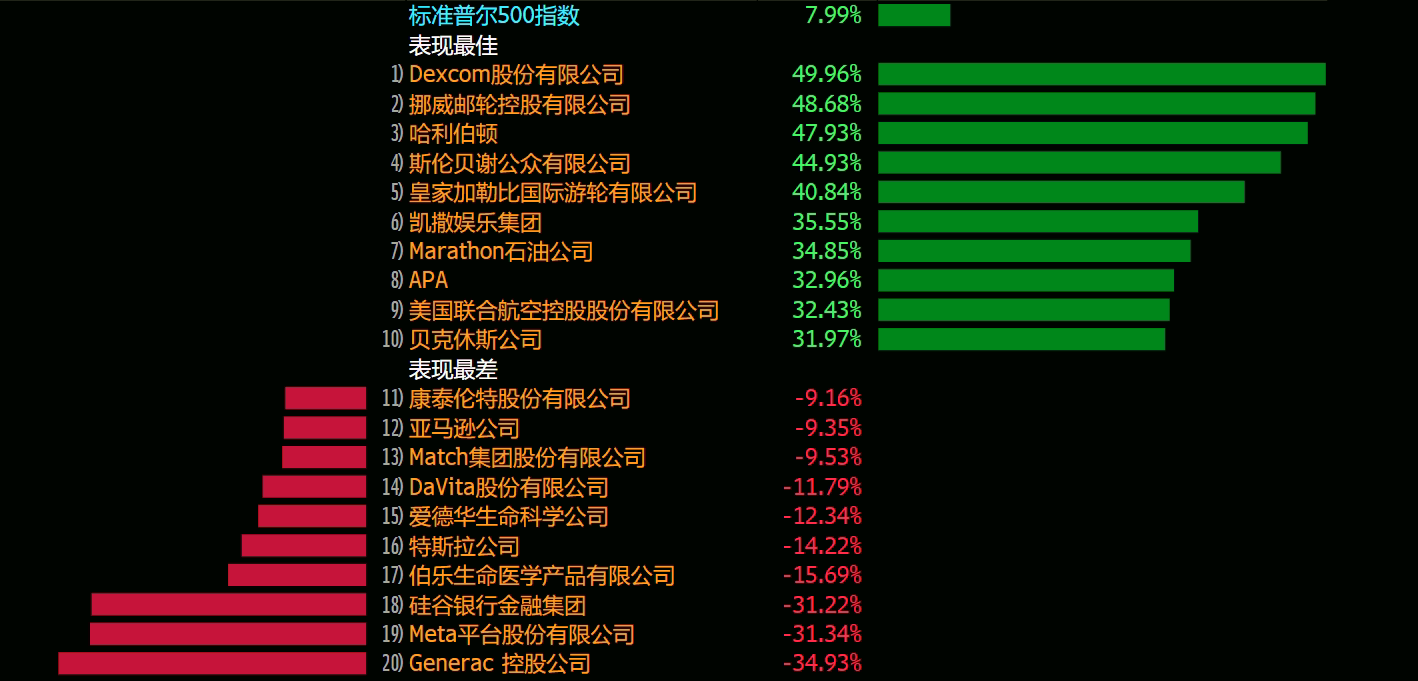 The better performance is also travel and energy companies, including$DexCom(DXCM)$$Norwegian Cruise Line(NCLH)$$Halliburton(HAL)$$Royal Caribbean Cruises(RCL)$$Caesars Entertainment(CZR)$$United Continental(UAL)$$APA Corporation(APA)$